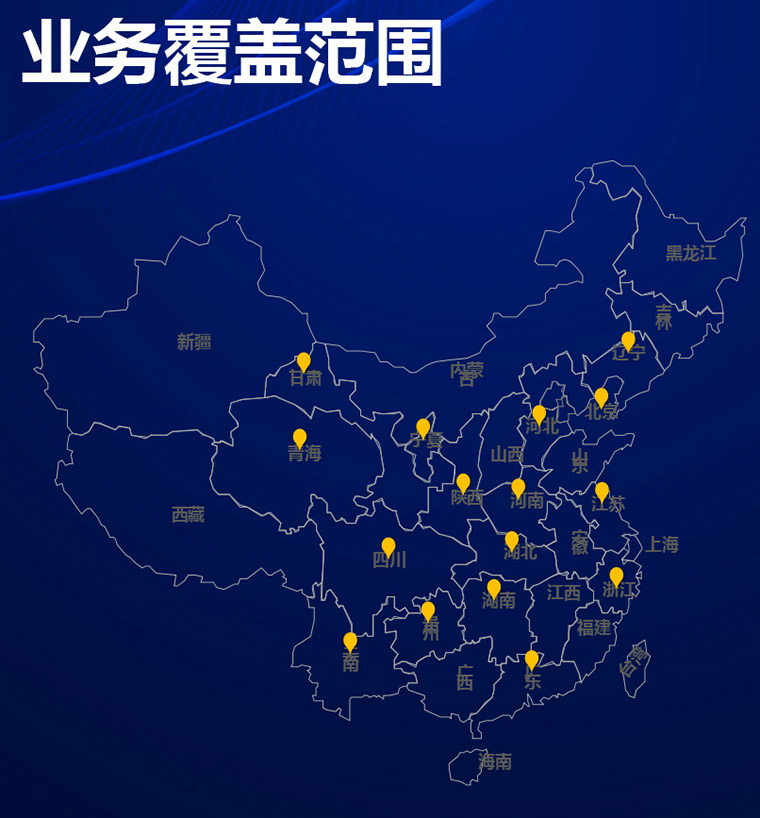 近年来公司业务覆盖范围: 1.辽宁省2.北京市3.河北省4.江苏省5.湖北省6.河南省7.湖南省8.浙江省 9.陕西省10.广东省11.云南省12.贵州省13.四川省14.青海省15.甘肃省16.宁夏自治区